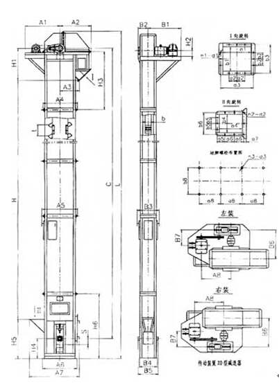 TD型皮帶式斗式提升機(jī)外形見(jiàn)下圖TD型斗式提升機(jī)外形圖,主要尺寸見(jiàn)表TD型皮帶式斗式提升機(jī)外形尺寸表,驅(qū)動(dòng)裝置配套及尺寸見(jiàn)表4-表6,選用YZ型驅(qū)動(dòng)裝置時(shí),其安裝尺寸與制造廠聯(lián)系。